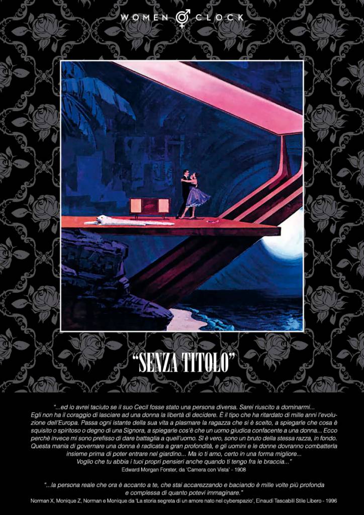 Anche oggi che, a parità di curriculum, capacità e carriera, le donne nel mondo occidentale, mediamente hanno il 20% in meno di stipendio. Come ricostruire il dialogo, come tessere nuovamente i fili ormai logori da troppo tempo, del rapporto tra uomini e donne? Non si possono certo dare risposte preconfezionate o sbrigative: l’ultima immagine proposta nella mostra è quella di un uomo e di una donna che danzano, insieme nella sala di una casa sospesa su una baia. Anche se si tratta dell’immagine pubblicitaria di un sistema di stereo degli anni ’60, simbolicamente mostra la via: danzare insieme perché insieme, Adami ed Eve, siamo stati cacciati dal Paradiso per approdare sulla terra, una terra difficile, ma vera. Per farne un territorio che possa ospitare entrambi.