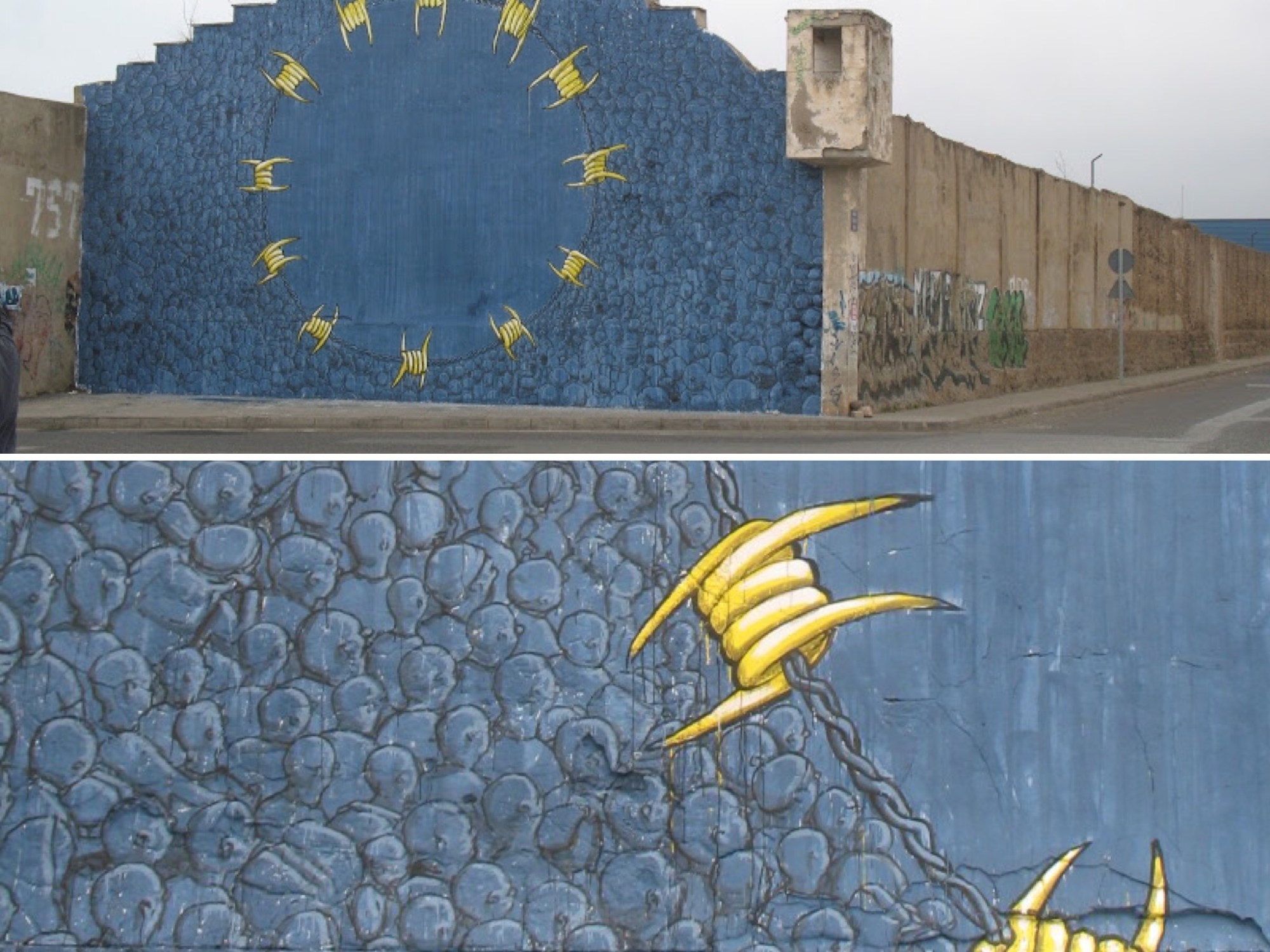 Blu è un artista: non “di” ma “in e “per” la strada. Di lui si sa poco. Pare sia di Senigallia. A partire dal 1999 si fa conoscere attraverso una serie di murales e graffiti eseguiti a Bologna, nel centro storico, nelle zone adiacenti all’Accademia di Belle Arti e in periferia, negli spazi occupati o nei centri sociali. Nel 2001 abbandona le bombolette spray. Comincia ad usare vernici a tempera e rulli montati su bastoni telescopici: ingrandisce la superficie pittorica. Riqualifica case e palazzi fatiscenti, abbandonati o, semplicemente, brutti. Si spinge oltre i confini nazionali. La lotta per la casa, il sostegno al recupero urbano, l’appoggio ai movimenti ambientalisti contro ciò che danneggia il territorio diventano le sue battaglie. Nel 2012, di ritorno da Buenos Aires, Blu si spinge per la prima volta in Africa: attraversa il confine tra Spagna e Marocco, si ferma a Melilla. Vive e vede l’esperienza migrante. Ne nasce un’opera di dimensioni imponenti: le dodici stelle della bandiera europea occupano l’intera facciata di un edificio e diventano il filo spinato che respinge una moltitudine di persone. È una dichiarazione di fallimento all’Europa, incapace di accogliere, chiusa, ostile. A marzo 2016 Blu ed altri writers decidono di cancellare dai muri di Bologna vent’anni di attività: è un’azione di denuncia artistica e politica contro la mercificazione e la privatizzazione della creatività. Alcuni lavori, infatti, erano stati indebitamente rimossi dai luoghi originari per esporli in una mostra convenzionale sulla street art, a Palazzo Pepoli. Anche l’arte, se le togli le radici, perde casa. È straniera. È muta. Scompare.