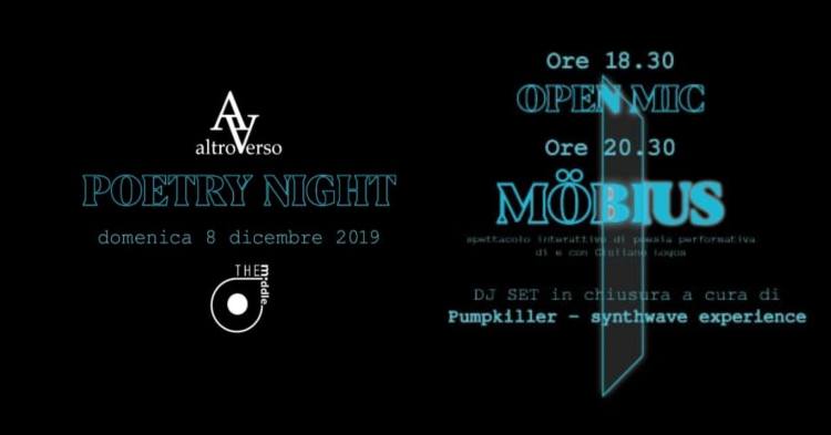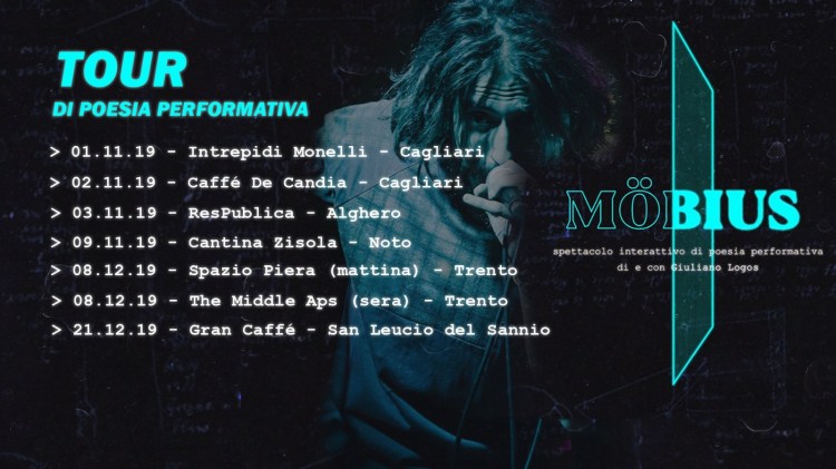 | *MÖBIUS* | di Giuliano Logos è uno storytelling la cui trama è *definita dalle scelte del pubblico*. I temi trattati spaziano dal rapporto tra individuo moderno e società e la ricerca del proprio scopo ultimo. Mattia Zadra poeta, scrittore e musicista trentino con cui abbiamo dato il via alla rubrica POETI MODERNI, porta insieme al collettivo AltroVerso in Piana Rotaliana dove è nato, al circolo The Middle – aps Mezzolombardo una performance interattiva di poesia performativa.